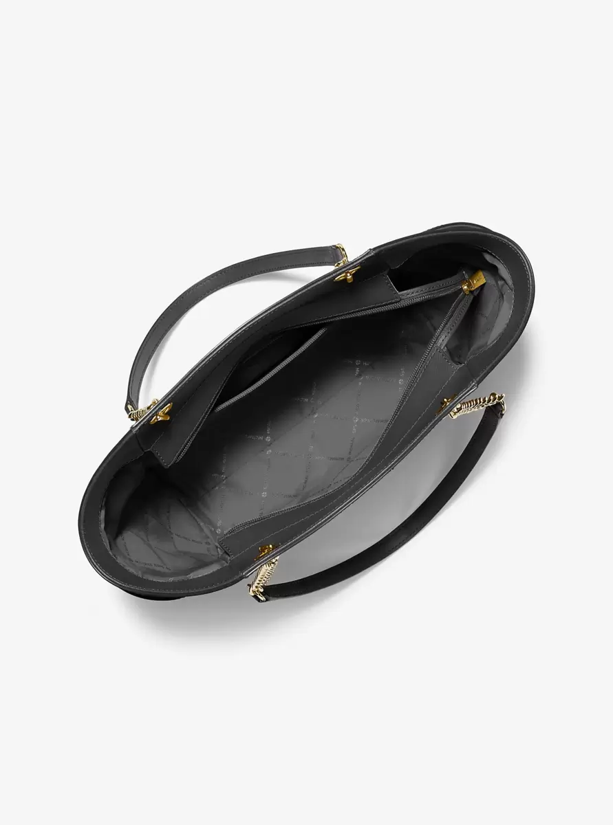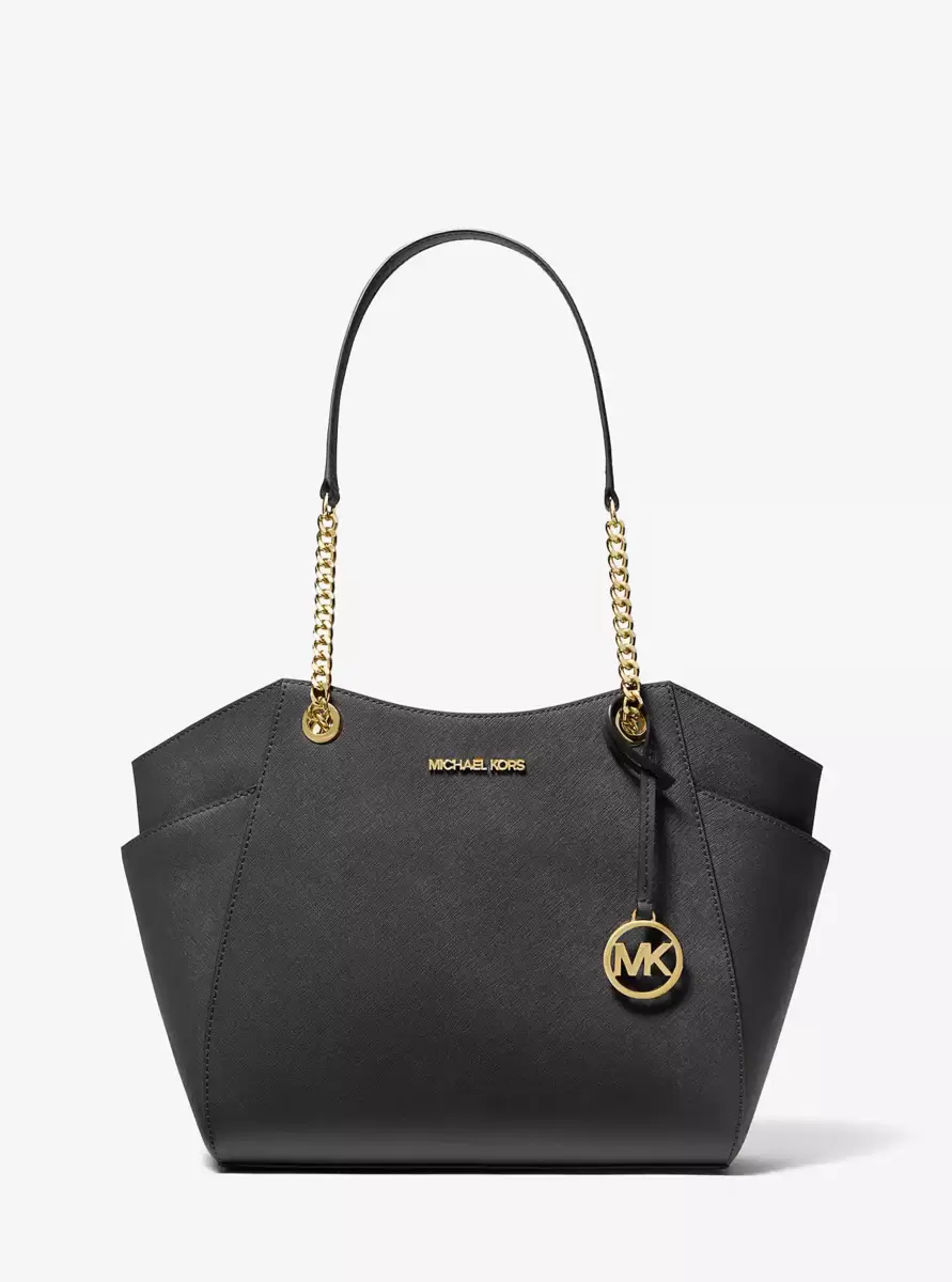 Ready to take you anywhere, this Jet Set shoulder bag is rendered in Saffiano leather and finished with our signature charm. The architectural shape features convenient side pockets and a secure top-zip fastening. Use it to carry all your travel essentials.
