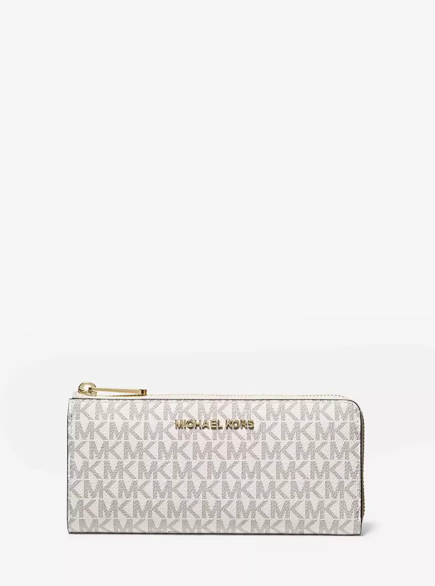 A compact accessory with maximum style, consider this sleek wallet for days that require on-the-go ease. Crafted from our iconic Signature-print canvas with contrasting trim for added flair, its slim silhouette partially unzips to reveal multiple card slots and a center compartment perfect for just the essentials. Slip it into the coordinating tote.