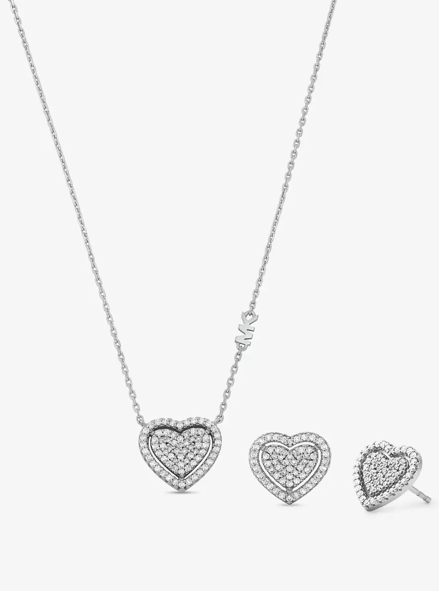 Birthday, holiday, just because—surprise and delight her with this glittering gift set. Encrusted with illuminating pavé accents, a heart pendant and matching stud earrings are sure to make her feel loved. Note the tiny MK charm punctuating the rhodium-plated sterling silver chain.