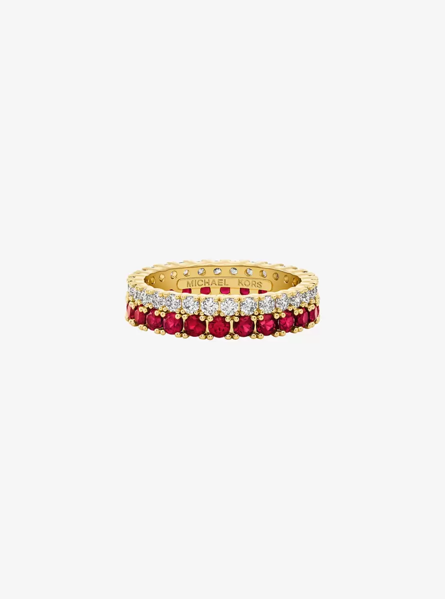 Give your jewelry collection a chic update with this tennis ring, a dazzling piece that’ll quickly become your favorite. Cast in brass, it features two rows of continuous pavé—each set with light-catching cubic zirconia in contrasting hues. Wear yours solo or stacked with other styles.