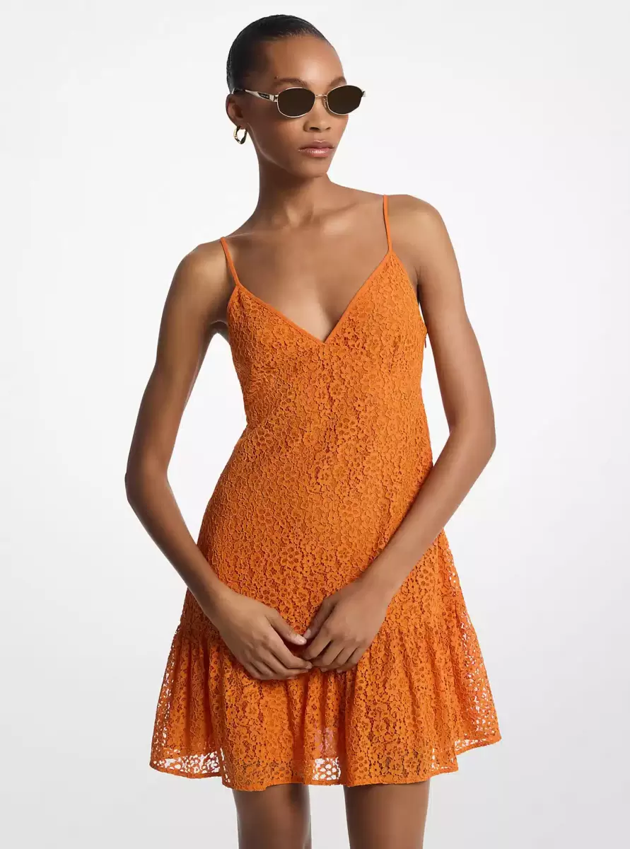 Usher in the sunshine with this vibrant mini dress. Corded floral lace and a ruffled hem create a feminine look, while adjustable straps ensure a perfect fit. Wear it during the day with sleek sunnies and flat leather sandals, switching to a raffia bag and strappy heels for date night.
