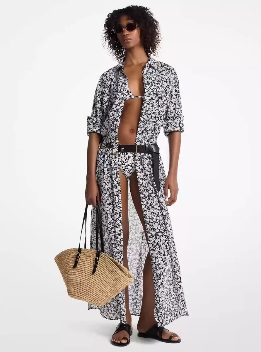 This shirtdress works equally well as a swimsuit coverup or day dress, ensuring it’ll save space in your suitcase. It’s made from lightweight cotton lawn printed with a floral motif in a loose fit that falls to a maxi length. Keep the bold motif in focus with minimal accessories.