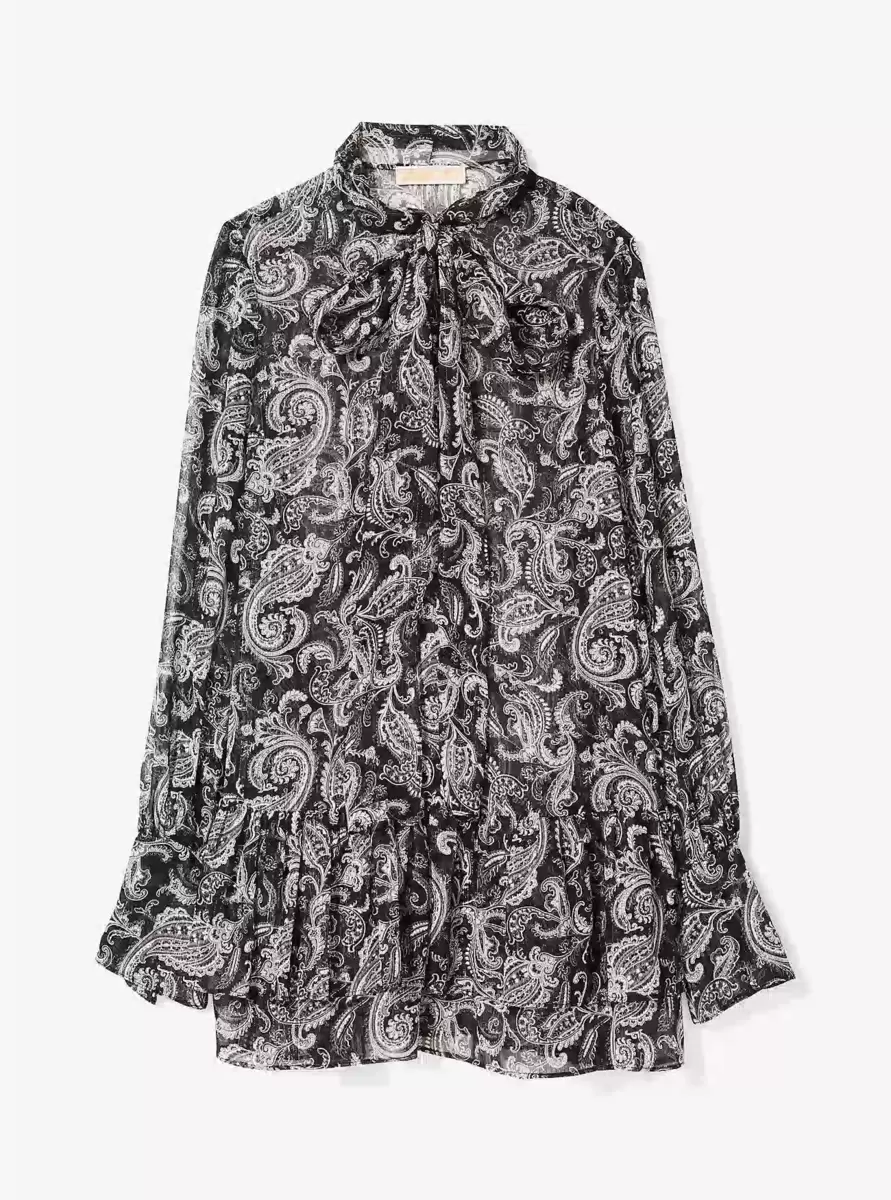 This romantic mini dress captures bohemian elegance with its intricate metallic paisley print and flowing silhouette. Featuring a high neckline with a tie detail and billowy long sleeves that gather at the cuffs, it’s finished with a tiered hem that adds movement and charm. Perfect for transitioning into fall, we like it styled with knee-high boots and a leather jacket.