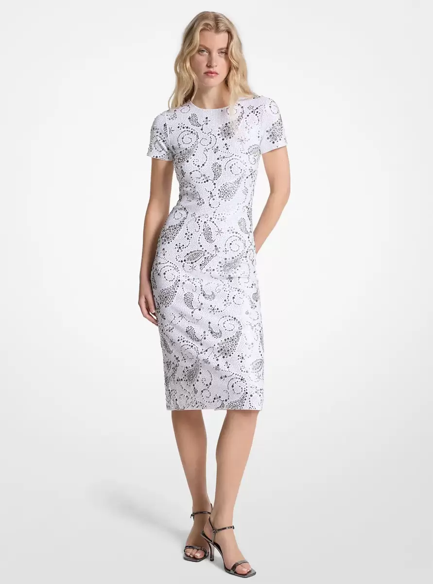 This midi dress makes a statement with its intricate paisley pattern adorned in sparkling embellishments. Designed with short sleeves and a figure-flattering silhouette, it delivers instant shine with a touch of bohemian flair. Style it with strappy heels and delicate jewelry for sophisticated daytime events or evening occasions.