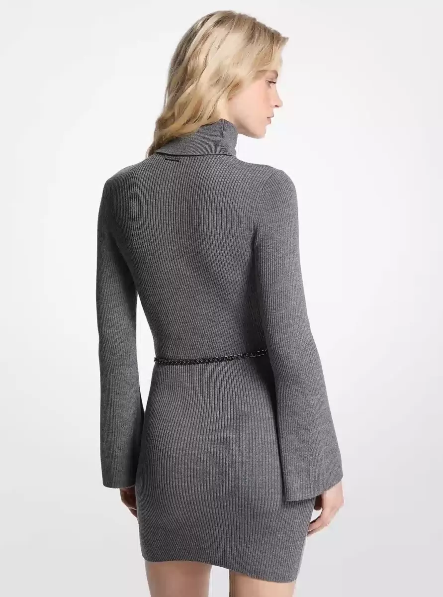 Simple yet striking, the figure-flattering fit of this mini dress is designed to contour and define your curves. It’s made of a ribbed stretch wool blend and has a chic turtleneck and bell sleeves. Wear it with or without the logo chain-link belt.