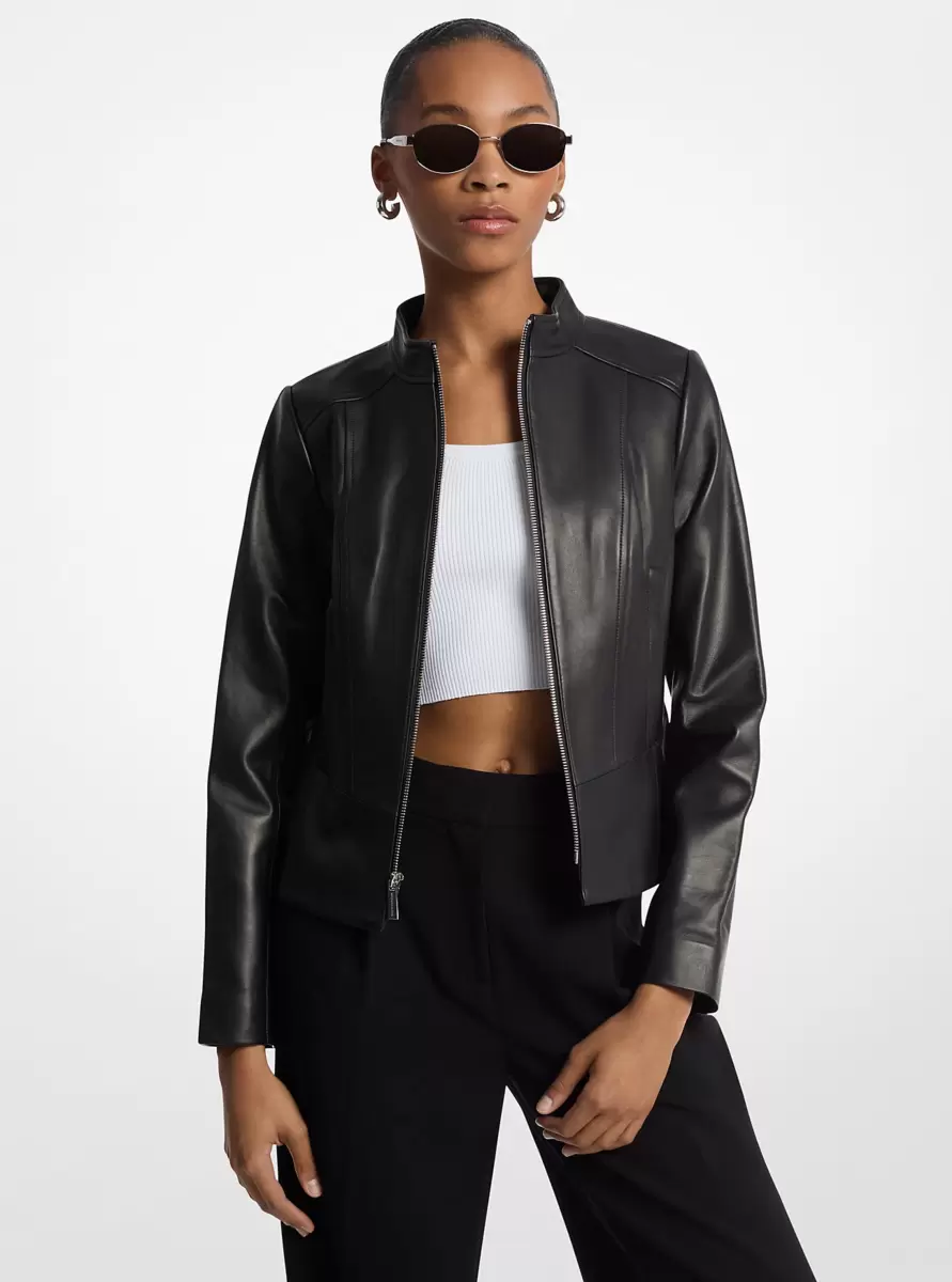 Stay sleek in this fitted leather jacket that’s perfect for your next night out. An understated stand collar, streamlined paneling and a zip front closure give this minimal silhouette a modern edge. Round out the tough-luxe look with the season’s fitted trousers or dark denim.