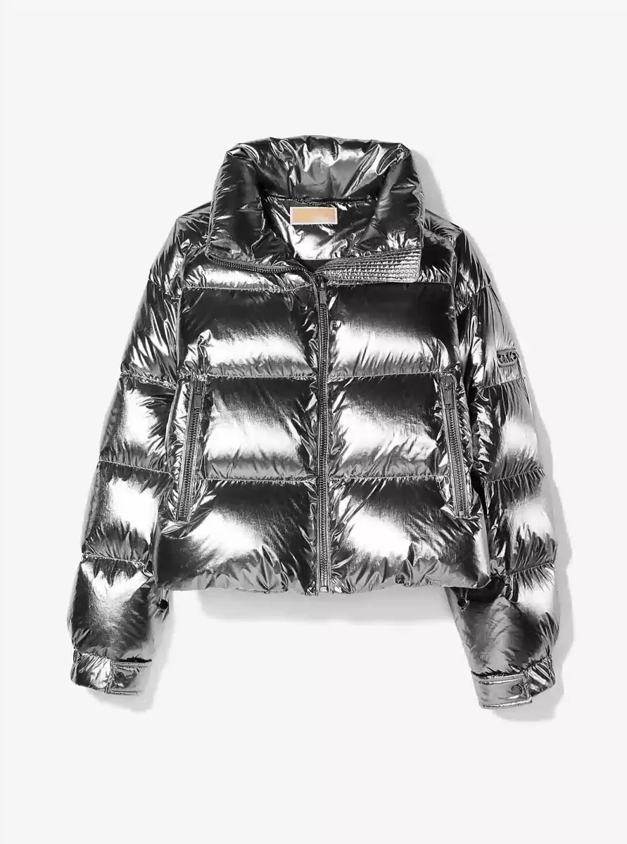 This metallic down jacket brings sophisticated shine to your outerwear collection. The lustrous foil finish and cropped silhouette create a modern, street-style inspired look that delivers both warmth and undeniable style. Layer it over an all-black ensemble with leggings and sneakers for an effortlessly cool off-duty look.