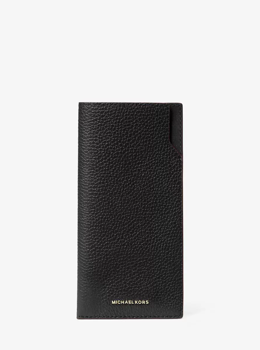 Expertly crafted from luxurious pebbled leather, our Jet Set Travel sunglasses case offers sophisticated protection for your favorite eyewear. This compact design features a sleek slip-in style with gold-tone logo detailing for an elevated finish. Perfect for the discerning traveler who values both style and functionality in every accessory.