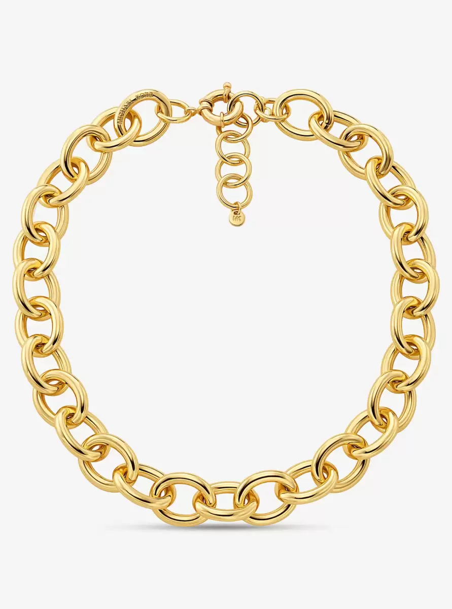 A statement piece you can wear every day, this necklace is crafted from brass and then plated with precious metal. The large, polished links are sure to turn heads when worn under a collared shirt or to accent a bare neckline.