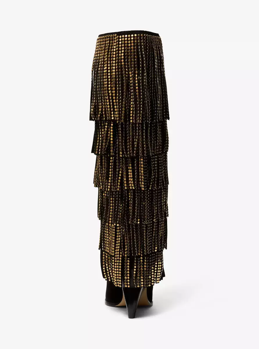 Studded tiered fringe creates mesmerizing movement on the suede Jayla tall boot. Let them steal the show when you team them with your favorite LBD.