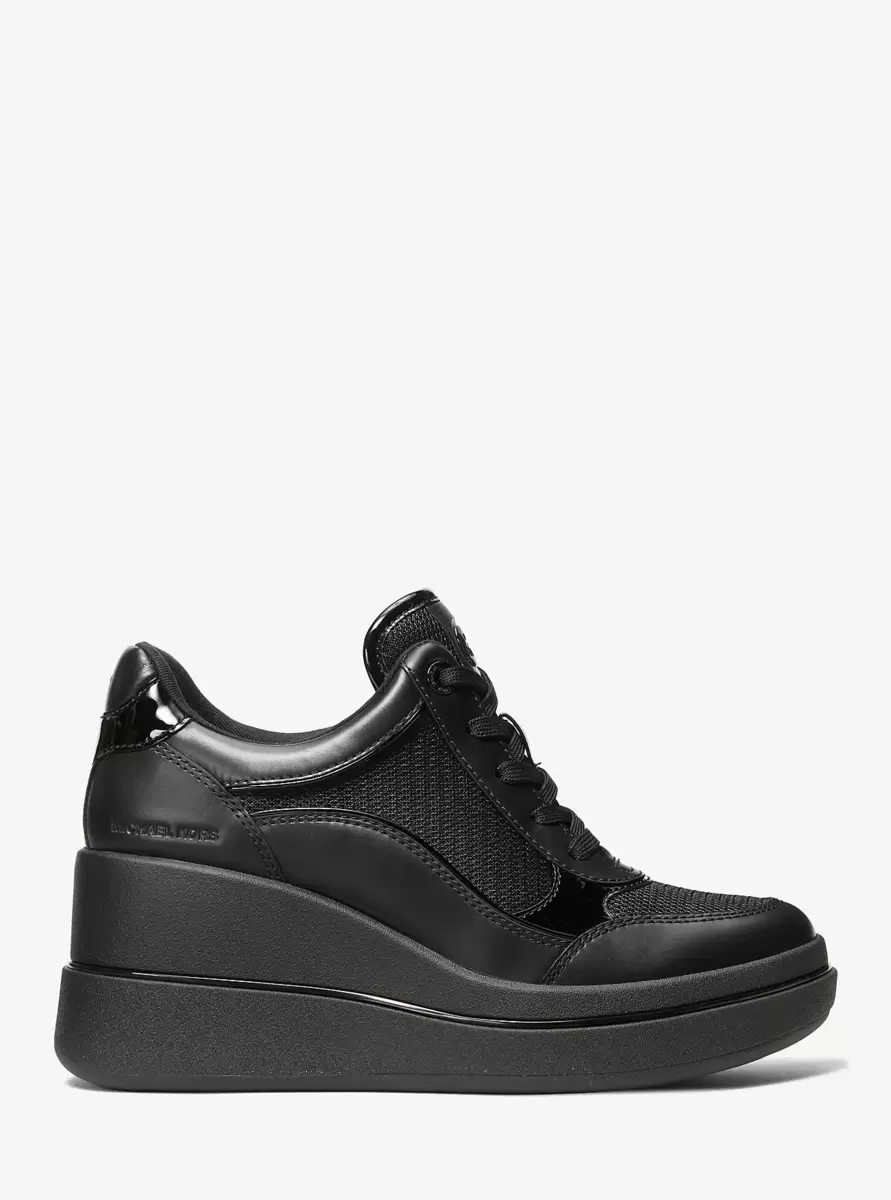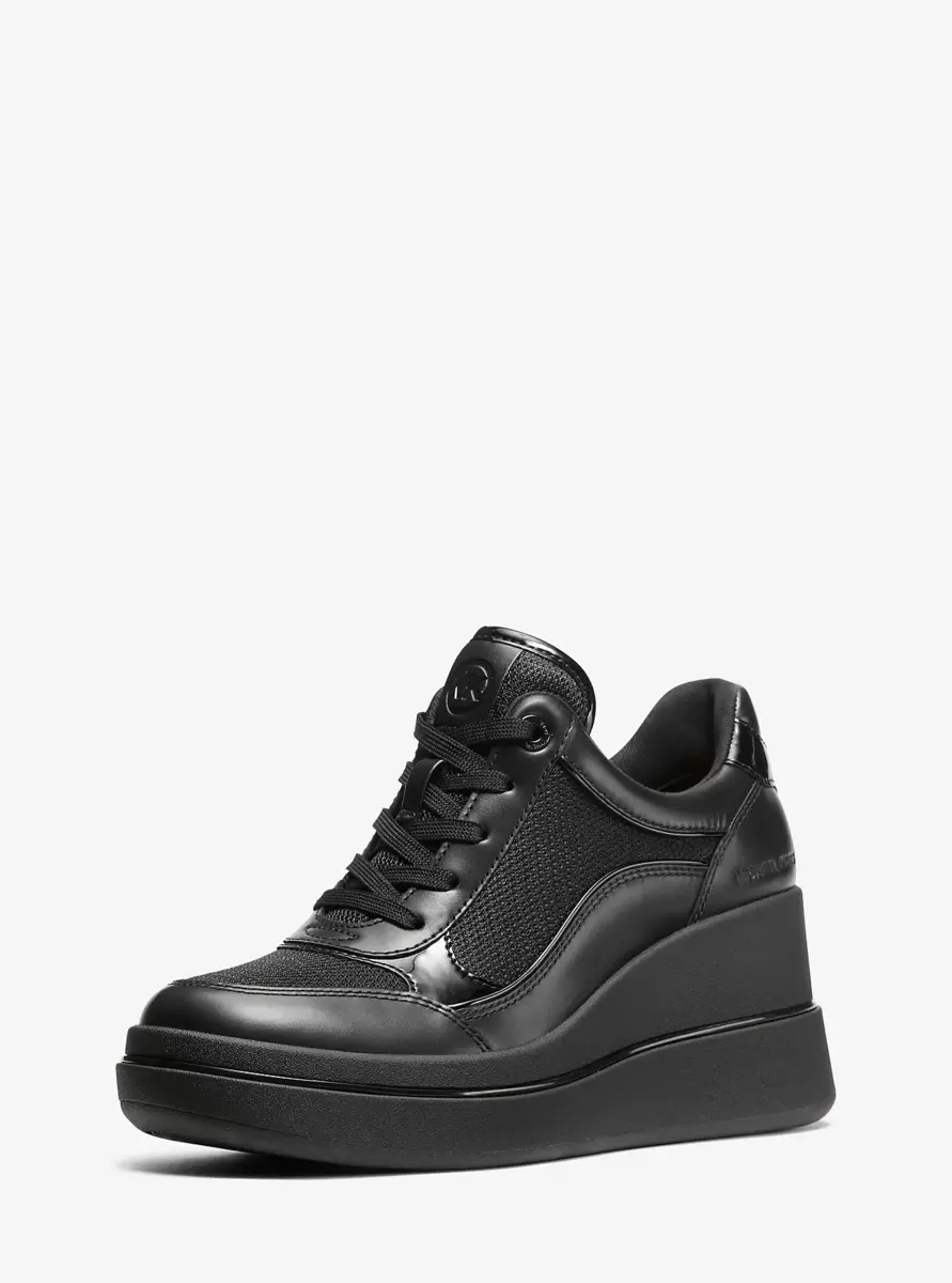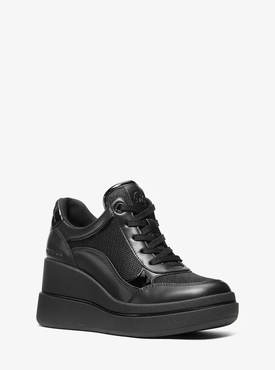 Elevate your everyday style with the Emmy wedge trainer. Crafted from smooth and patent leather with breathable mesh panels, this contemporary design features a lace-up fastening and a platform sole. The monochromatic black colorway ensures versatility, making it the perfect choice to pair with cropped denim or your favorite midi dress for an effortlessly chic look.
