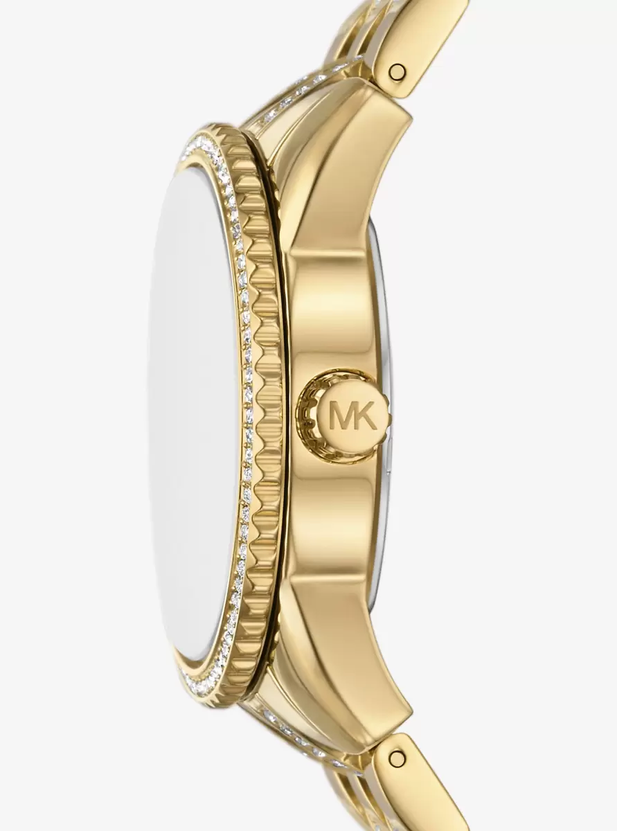 Our Bryant watch is the epitome of gilded glamour. Sparkling MK initials take center stage on the face of this mini timepiece, while pavé accents encrust the topring and bracelet strap. Add it to a glistening wrist stack for an instant “wow” factor.