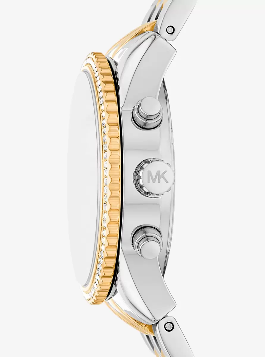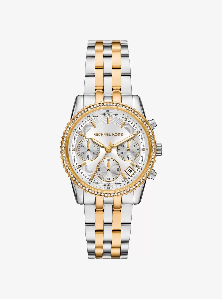 Radiant and refined, the Bryant watch combines gold-and-silver-tone stainless steel with a menswear-inspired bracelet strap for a chic and timeless finish. The chronograph display lends functionality, while pavé embellishments along the bezel deliver a touch of shine.