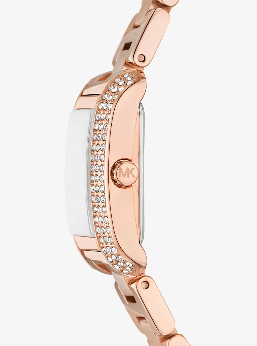 Delicate lines of pavé crystals add shine to the rectangular face of our mini Emery watch. The polished beveled strap is made of rose gold-tone stainless steel, while the dial features Roman numeral indexes for a luxurious finish. Glamorous enough to pair with evening looks yet understated enough to complement a simple T-shirt and jeans, this is a timeless style you’ll never want to take off.