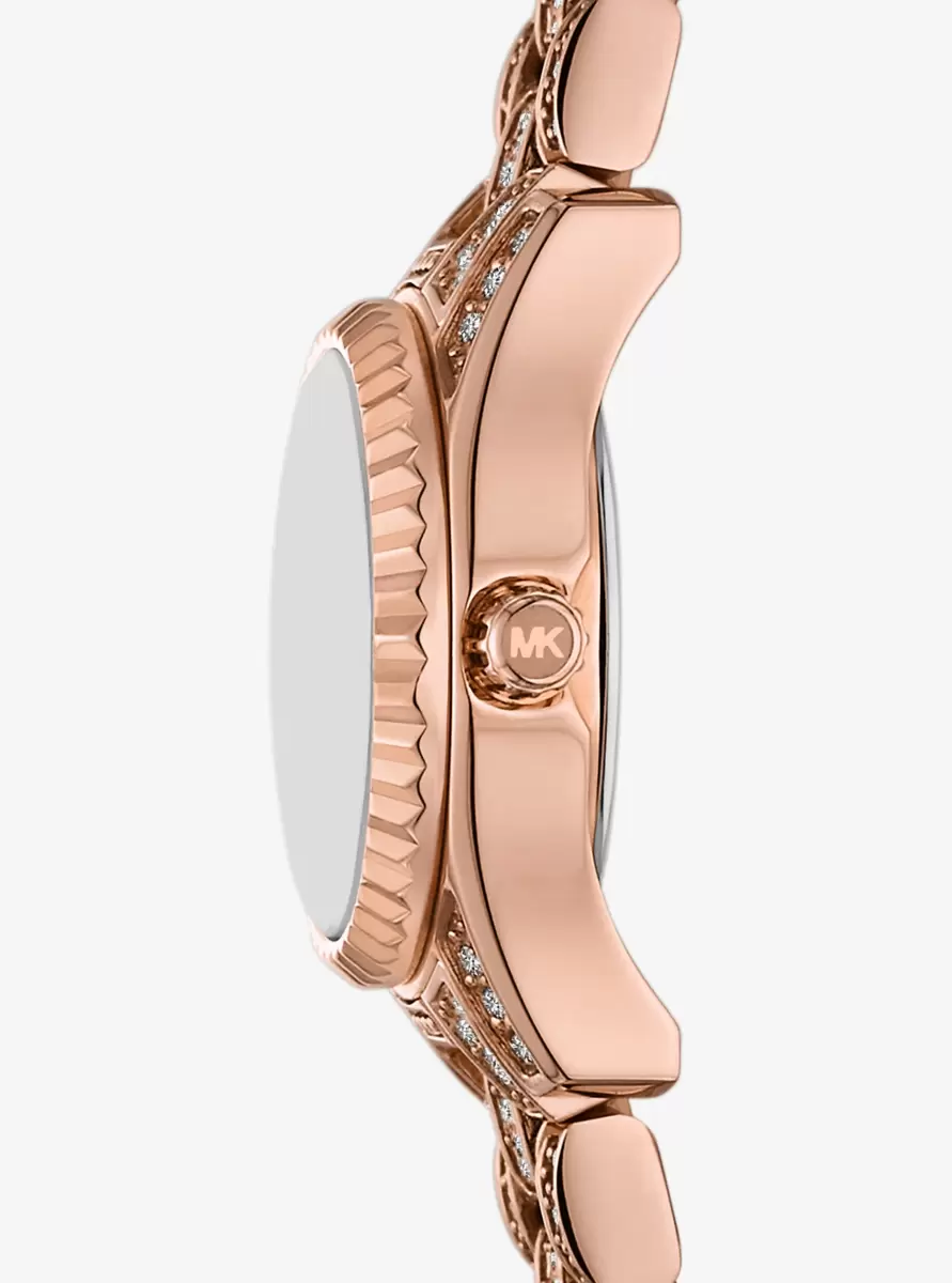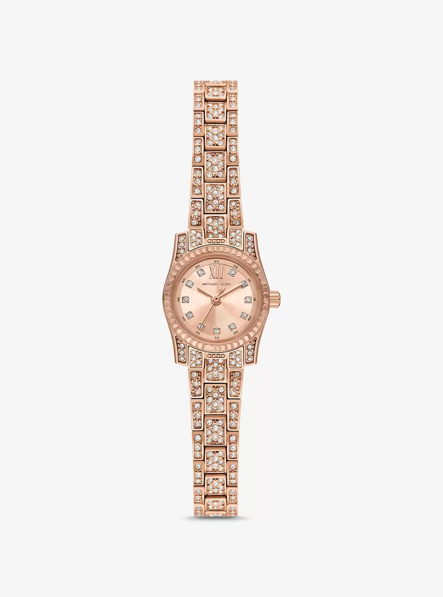 The Lexington watch exudes opulence with its rose-gold-tone hue and sparkling pavé accents. Made entirely of stainless steel, this micro timepiece boasts a round face with a beveled topring and a matching bracelet strap. Slip it on to give evening outfits a maximum dose of glamour.