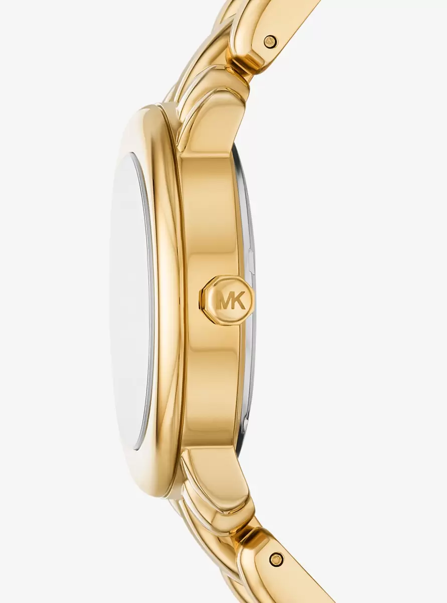 Refined and sculptural, the Phoebe watch showcases our new MK Pop Charm on the dial. Crafted from gold-tone stainless steel, it features a distinctive puffy chain-link bracelet with a radiant finish that catches the light. Style it as a statement piece for both workday ensembles and evening occasions.