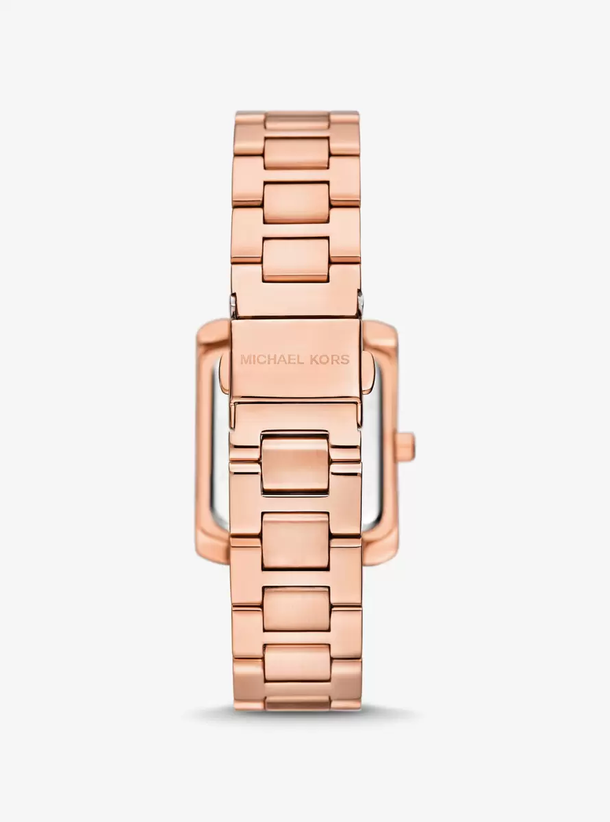 This pavé-encrusted three-piece set includes our petite Emery watch as the centerpiece alongside a chain-link bracelet and hoop earrings. The rose gold-tone timepiece features a rectangular face, beveled strap and Roman numeral indexes for a classic finish. Worn together, these pieces are simply dazzling.